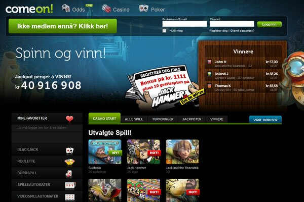 Bonuser og kampanjer Comeon casino velkomstbonus er 100 % opptil 1000 kr og må omsettes 30 ganger sammen med innskuddet ditt. Det vil si at om du setter inn 1000 kr og mottar bonus på 1000 kr, blir regnestykket slik: 30x(1000+1000)=6000 kr før du kan ta ut gevinsten fra bonusen i kontanter. Ønsker du å ta ut penger før det, mister du resten av bonusen din. Men hos ComeOn! kan du satse ekte penger og bonusen samtidig, og på denne måten sikre at bonusen ikke går tapt, omsettes raskere og gevinsten kan bli større. I tillegg får du 10 gratisspinn på videoautomaten Jack Hammer når du melder deg inn. ComeOn-poeng er noe du mottar uansett hva du gjør inne på Comeon. Når du logger inn mottar du poeng, når du registrerer mobilnummer, gjør et innskudd med mer. Disse poengene kan du bruke i comeon-butikken. Der kan du hente gratispenger, lotterier og innskuddsbonuser. Det er gratis å delta i turneringer, og turneringer arrangerer comeon hver eneste dag. Kom deg på ledertavlen og vinn kontanter.